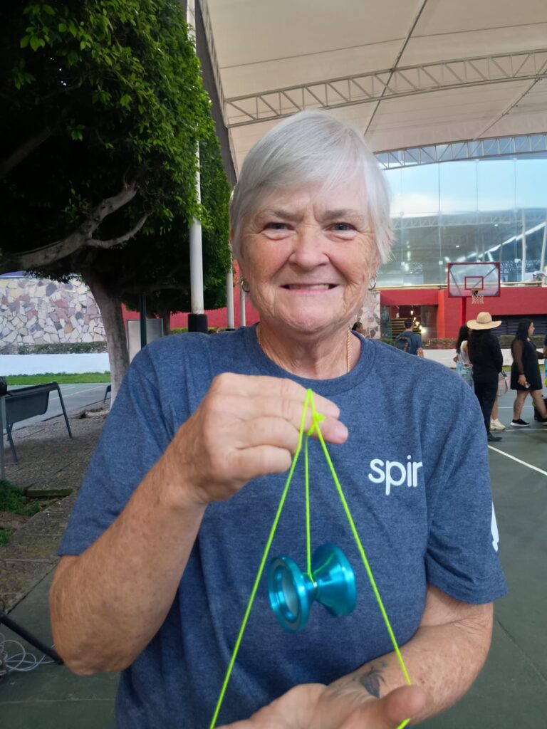 La sexagenaria Val Oliver, nació en Estados Unidos y recuerda cuándo fue la primera vez que tuvo contacto con el yoyo: “Desde que tenía seis años juego yoyo. Hoy tengo 66 años. Yo vi que un hombre que jugaba yoyo, llegó al pueblo en Minnessota (USA), mi hermano y yo lo seguimos por todas las calles”.